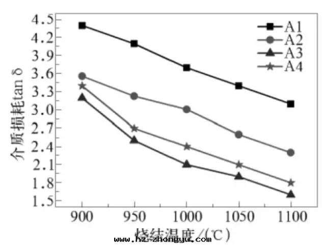 上(shàng)图(tú)是(shì)基板材料的(de)介電(diàn)常数随燒結温(wēn)度(dù)變(biàn)化曲(qū)線(xiàn)。可(kě)看(kàn)出(chū)随着温(wēn)度(dù)升(shēng)高(gāo),其(qí)介電(diàn)常数随之(zhī)升(shēng)高(gāo)。當温(wēn)度(dù)达(dá)到(dào)1100 ℃时(shí),介電(diàn)常数达(dá)到(dào)最(zuì)大(dà)值。當微米Al2O3 添加量(liàng)從50 wt% 變(biàn)化至(zhì)65 wt%,納米CaZrO3 添加量(liàng)從20 wt% 變(biàn)化至(zhì)5 wt% 时(shí),氧化鋁(lǚ)集成(chéng)電(diàn)路(lù)基板材料的(de)介電(diàn)常数呈先(xiān)增加后減少(shǎo)的(de)趨勢。當微米Al2O3 含量(liàng)为(wèi)60 wt%,納米CaZrO3 含量(liàng)为(wèi)10 wt% 的(de)时(shí)候,所(suǒ)制備的(de)樣(yàng)品性(xìng)能(néng)最(zuì)佳。这(zhè)是(shì)因(yīn)为(wèi)影響介電(diàn)常数的(de)因(yīn)素是(shì)多(duō)方(fāng)面(miàn)的(de),只(zhī)要(yào)涉及(jí)配方(fāng)组成(chéng)中(zhōng)化學(xué)组成(chéng),當堿金(jīn)屬離子氧化物(wù)的(de)含量(liàng)越多(duō),其(qí)介電(diàn)常数越大(dà)。另(lìng)外(wài),温(wēn)度(dù)升(shēng)高(gāo)过(guò)程中(zhōng)各(gè)離子和(hé)偶极子的(de)热(rè)運動(dòng)会(huì)随着加強(qiáng),最(zuì)終(zhōng)導致(zhì)介電(diàn)常数增加。
