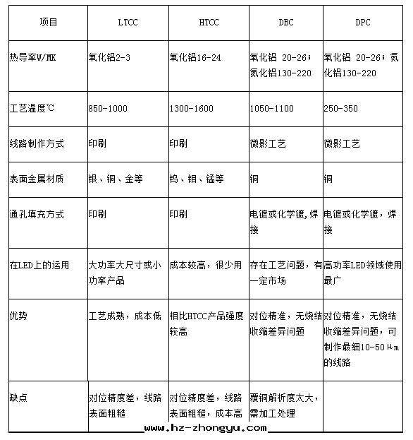 目前(qián)市场(chǎng)上(shàng)的(de)陶瓷散热(rè)基板種(zhǒng)類(lèi)很多(duō),工藝也(yě)不(bù)盡相同(tóng),廠(chǎng)家(jiā)根(gēn)據(jù)LED産品的(de)散热(rè)需要(yào)選擇合适的(de)散热(rè)基板,最(zuì)終(zhōng)在(zài)散热(rè)性(xìng)能(néng)和(hé)成(chéng)本(běn)上(shàng)达(dá)到(dào)最(zuì)好(hǎo)的(de)綜合效果(guǒ)。陶瓷散热(rè)基板根(gēn)據(jù)材料分(fēn)有(yǒu)主(zhǔ)要(yào)有(yǒu)氧化鋁(lǚ)基板和(hé)氮化鋁(lǚ)基板,根(gēn)據(jù)結構分(fēn)主(zhǔ)要(yào)有(yǒu)單层(céng)基板和(hé)多(duō)层(céng)基板(两(liǎng)层(céng))。現(xiàn)階(jiē)段(duàn)較普遍(biàn)的(de)陶瓷散热(rè)基板種(zhǒng)類(lèi)共(gòng)有(yǒu)LTCC(低(dī)温(wēn)共(gòng)燒多(duō)层(céng)陶瓷基板)、HTCC(高(gāo)温(wēn)共(gòng)燒多(duō)层(céng)陶瓷)、DBC(直(zhí)接接合铜(tóng)基板)、DPC(直(zhí)接鍍铜(tóng)基板)四(sì)種(zhǒng),其(qí)中(zhōng)HTCC屬于(yú)較早(zǎo)期(qī)發(fà)展(zhǎn)之(zhī)技術(shù),但由于(yú)其(qí)較高(gāo)的(de)工藝温(wēn)度(dù)(1300~1600℃),使其(qí)電(diàn)极材料的(de)選擇受限,且(qiě)制作(zuò)成(chéng)本(běn)相當昂貴,这(zhè)些因(yīn)素促使LTCC的(de)發(fà)展(zhǎn),LTCC雖(suī)然将共(gòng)燒温(wēn)度(dù)降至(zhì)約850℃,但其(qí)尺寸(cùn)精确度(dù)、産品強(qiáng)度(dù)等技術(shù)上(shàng)的(de)問(wèn)題(tí)尚待突破。而(ér)DBC與(yǔ)DPC則为(wèi)近幾(jǐ)年(nián)才開(kāi)發(fà)成(chéng)熟,且(qiě)能(néng)量(liàng)産化的(de)專業技術(shù),但对(duì)于(yú)許多(duō)人来(lái)说(shuō),此(cǐ)两(liǎng)項專業的(de)工藝技術(shù)仍然很陌生(shēng),甚至(zhì)可(kě)能(néng)将两(liǎng)者(zhě)誤解(jiě)为(wèi)同(tóng)樣(yàng)的(de)工藝。DBC是(shì)利用高(gāo)温(wēn)加热(rè)将Al2O3與(yǔ)Cu板結合,其(qí)技術(shù)瓶(píng)頸在(zài)于(yú)不(bù)易解(jiě)決Al2O3與(yǔ)Cu板間(jiān)微气(qì)孔産生(shēng)之(zhī)問(wèn)題(tí),这(zhè)使得該産品的(de)産能(néng)與(yǔ)良率受到(dào)較大(dà)的(de)挑戰,而(ér)DPC技術(shù)則是(shì)利用直(zhí)接披覆技術(shù),将Cu沉積于(yú)Al2O3基板之(zhī)上(shàng),該工藝結合了材料與(yǔ)薄膜工藝技術(shù),其(qí)産品为(wèi)近年(nián)最(zuì)普遍(biàn)使用的(de)陶瓷散热(rè)基板,然而(ér)其(qí)材料控制與(yǔ)工藝技術(shù)整合能(néng)力要(yào)求較高(gāo),这(zhè)使得跨入DPC産業並(bìng)能(néng)穩定(dìng)生(shēng)産的(de)技術(shù)門(mén)檻相对(duì)較高(gāo)。