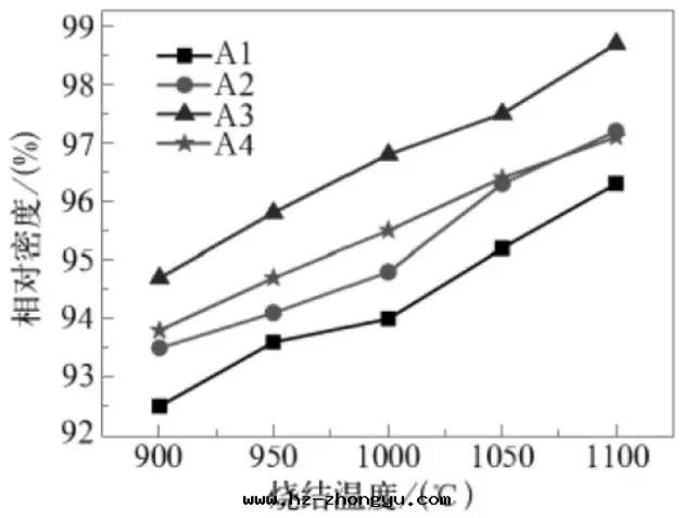 上(shàng)图(tú)是(shì)添加不(bù)同(tóng)量(liàng)微米Al2O3 和(hé)納米CaZrO3粉后对(duì)氧化鋁(lǚ)陶瓷集成(chéng)電(diàn)路(lù)基板材料相对(duì)密度(dù)的(de)影響。由图(tú)可(kě)知随着温(wēn)度(dù)的(de)升(shēng)高(gāo),其(qí)基板材料的(de)相对(duì)密度(dù)随着升(shēng)高(gāo),温(wēn)度(dù)达(dá)到(dào)1100 ℃达(dá)到(dào)最(zuì)大(dà)值。當微米Al2O3 的(de)添加量(liàng)为(wèi)60 wt%,納米ZrO2 的(de)添加量(liàng)为(wèi)10 wt% 时(shí),氧化鋁(lǚ)陶瓷集成(chéng)電(diàn)路(lù)基板材料的(de)相对(duì)密度(dù)相对(duì)其(qí)它(tā)配方(fāng)最(zuì)大(dà),此(cǐ)时(shí)樣(yàng)品較致(zhì)密,有(yǒu)利于(yú)氧化鋁(lǚ)陶瓷集成(chéng)電(diàn)路(lù)基板材料力學(xué)性(xìng)能(néng)的(de)提(tí)高(gāo)。