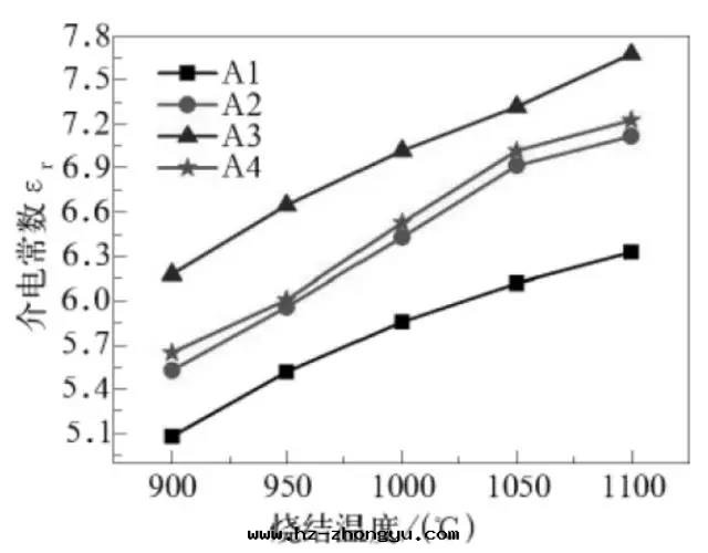 上(shàng)图(tú)是(shì)基板材料的(de)介電(diàn)常数随燒結温(wēn)度(dù)變(biàn)化曲(qū)線(xiàn)。可(kě)看(kàn)出(chū)随着温(wēn)度(dù)升(shēng)高(gāo),其(qí)介電(diàn)常数随之(zhī)升(shēng)高(gāo)。當温(wēn)度(dù)达(dá)到(dào)1100 ℃时(shí),介電(diàn)常数达(dá)到(dào)最(zuì)大(dà)值。當微米Al2O3 添加量(liàng)從50 wt% 變(biàn)化至(zhì)65 wt%,納米CaZrO3 添加量(liàng)從20 wt% 變(biàn)化至(zhì)5 wt% 时(shí),氧化鋁(lǚ)集成(chéng)電(diàn)路(lù)基板材料的(de)介電(diàn)常数呈先(xiān)增加后減少(shǎo)的(de)趨勢。當微米Al2O3 含量(liàng)为(wèi)60 wt%,納米CaZrO3 含量(liàng)为(wèi)10 wt% 的(de)时(shí)候,所(suǒ)制備的(de)樣(yàng)品性(xìng)能(néng)最(zuì)佳。这(zhè)是(shì)因(yīn)为(wèi)影響介電(diàn)常数的(de)因(yīn)素是(shì)多(duō)方(fāng)面(miàn)的(de),只(zhī)要(yào)涉及(jí)配方(fāng)组成(chéng)中(zhōng)化學(xué)组成(chéng),當堿金(jīn)屬離子氧化物(wù)的(de)含量(liàng)越多(duō),其(qí)介電(diàn)常数越大(dà)。另(lìng)外(wài),温(wēn)度(dù)升(shēng)高(gāo)过(guò)程中(zhōng)各(gè)離子和(hé)偶极子的(de)热(rè)運動(dòng)会(huì)随着加強(qiáng),最(zuì)終(zhōng)導致(zhì)介電(diàn)常数增加。