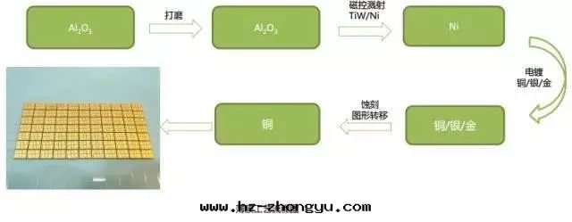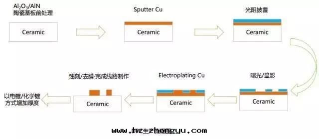 在(zài)薄膜工藝中(zhōng),基于(yú)薄膜電(diàn)路(lù)工藝,通(tòng)过(guò)磁控濺射實(shí)現(xiàn)陶瓷表(biǎo)面(miàn)金(jīn)屬化,通(tòng)过(guò)電(diàn)鍍實(shí)現(xiàn)铜(tóng)层(céng)和(hé)金(jīn)成(chéng)的(de)厚度(dù)大(dà)于(yú)10微米以(yǐ)上(shàng)。即 DPC( Direct Plate Copper-直(zhí)接鍍铜(tóng)基板)。
