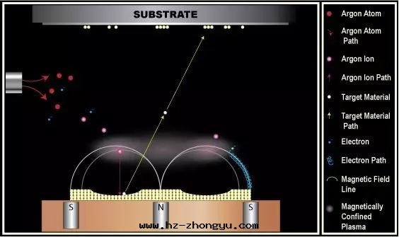 6、磁控濺射:利用气(qì)體(tǐ)輝光(guāng)放(fàng)電(diàn)过(guò)程中(zhōng)産生(shēng)的(de)正(zhèng)離子與(yǔ)靶材料的(de)表(biǎo)面(miàn)原子之(zhī)間(jiān)的(de)能(néng)量(liàng)和(hé)動(dòng)量(liàng)交換,把(bǎ)物(wù)質(zhì)從源材料移向襯底,實(shí)現(xiàn)薄膜的(de)澱積。